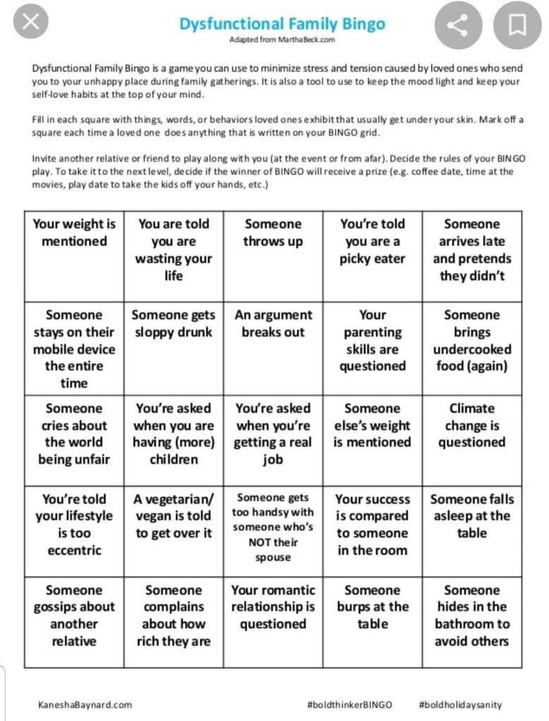 Ooh I remembered Dysfunctional Family Bingo. I feel already hit some of the spots over a casual lunch with relatives or a kid’s birthday party. It doesn’t need to be Thanksgiving.